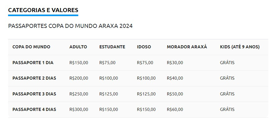 Enquanto estudantes e idosos (pessoas acima de 60 anos) terão 50% de desconto na compra dos passaportes, a organização preparou um desconto super especial de 80%, para os moradores da cidade-sede, Araxá. Crianças, de até 9 anos, não pagam entrada, ou seja, garantindo assim 100% de desconto, porém também devendo fazer o cadastro no sistema de venda de ingressos.
