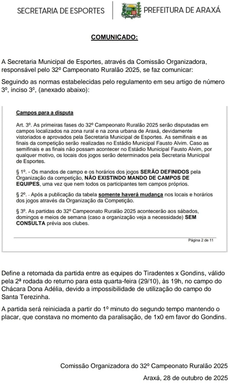 A organização da 32ª edição do Ruralão definiu pela continuidade da partida nesta quarta-feira, 29, às 20 horas, no Chácara Dona Adélia, conforme comunicado abaixo: